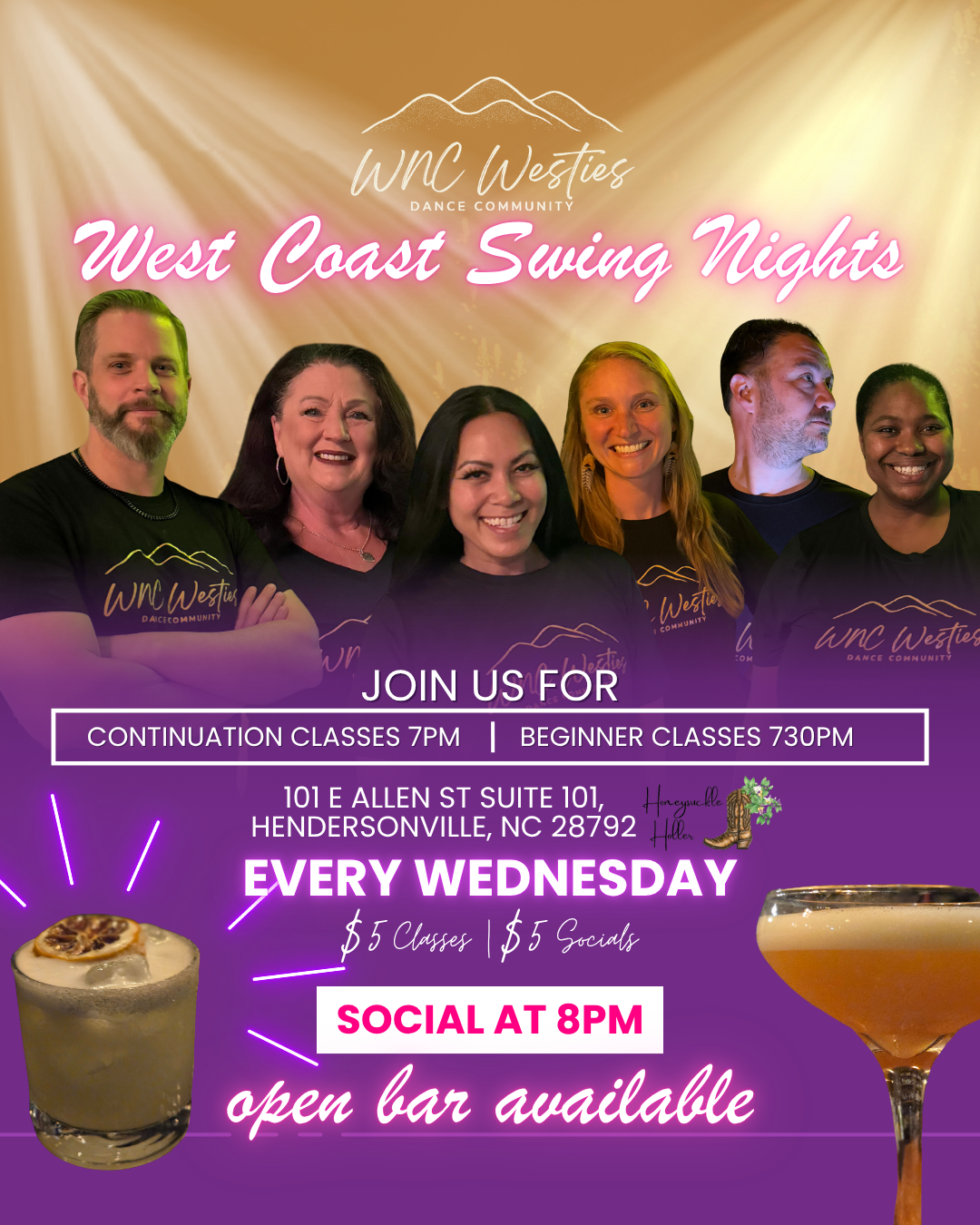 Honeysuckle Holler 101 E Allen St. Suite 101, Hendersonville, NC, N, United StatesGet ready to move, connect, and grow your dancing every Wednesday this April! 💃🕺 Join us for a weekly West Coast Swing night designed for dancers of all levels — […]