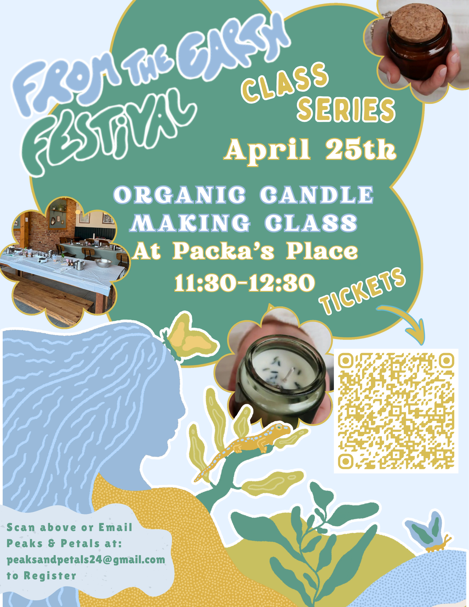 Come learn to make your own organic soy candles. You’ll also get to choose your scent and florals for the top.