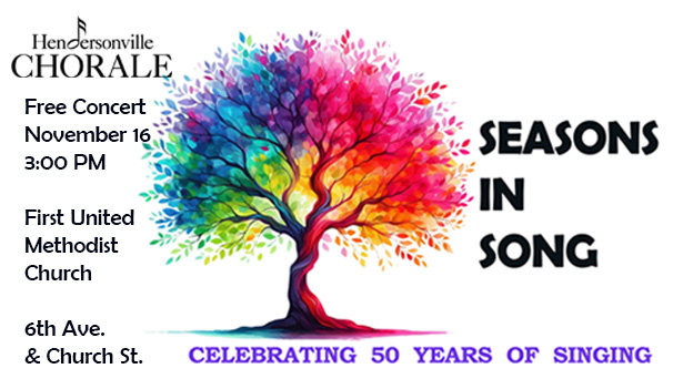 The Hendersonville Chorale will present its Fall Concert, Seasons in Song, at 3:00 PM on Sunday, November 16, at Hendersonville’s First United Methodist Church at 204 Sixth Avenue West (corner of Sixth and Church Streets). The concert will include choral works by renowned contemporary composers John Rutter, Paul Carey, Gwyneth Walker, and others. Local instrumentalists will provide piano, organ, and orchestral accompaniment. This is the final concert in the Hendersonville Chorale’s 50th Anniversary year.