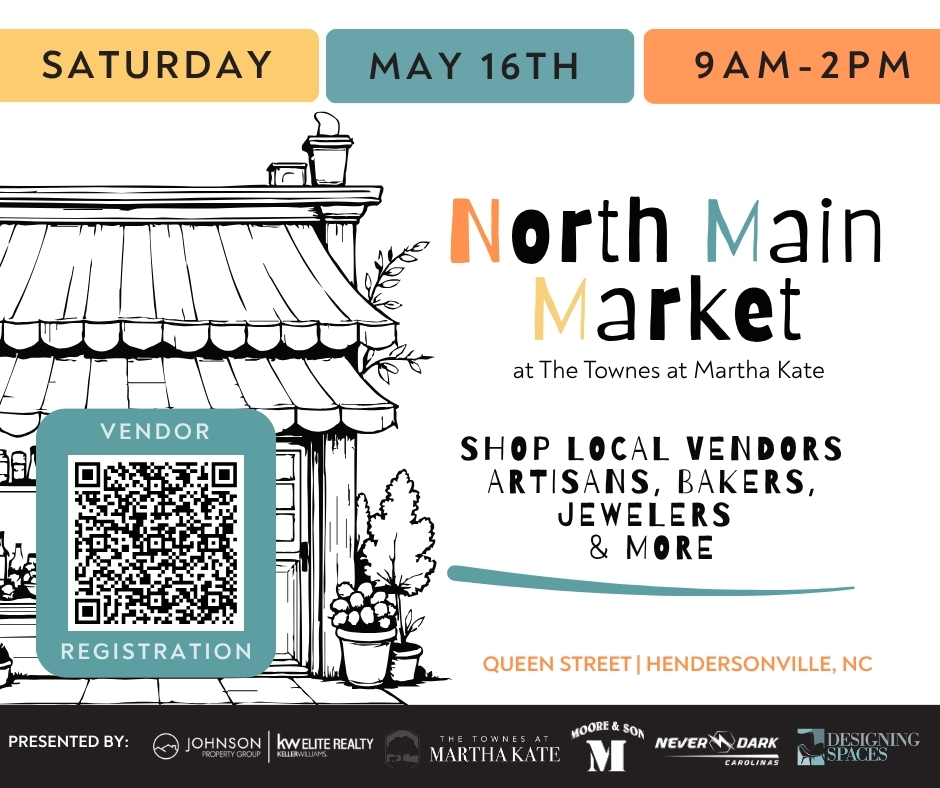 The North Main Market at The Townes at Martha Kate is built to celebrate the heart of Hendersonville—supporting local makers, small businesses, and the people behind them. We’re thrilled to showcase our community’s talent and the value they bring to our city. The North Main vendor market is an event designed to create a welcoming, high-quality space where neighbors can connect, shop local, and experience the best of what our area has to offer. We are committed to creating a professional, well-organized, and enjoyable event for both vendors and attendees. We look forward to strolling and shopping with you!