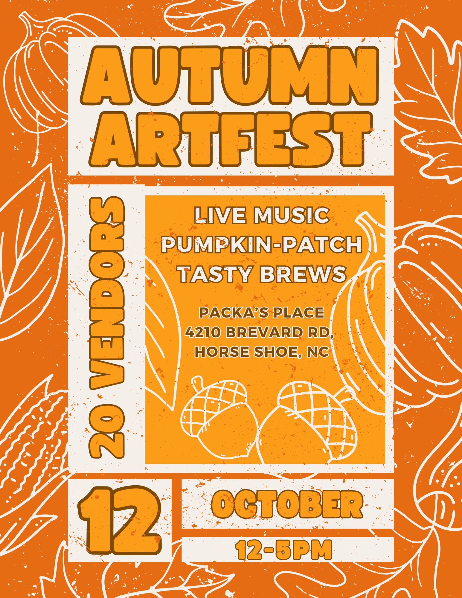Packa's Place 4210 Brevard Rd., Horse Shoe, NC, United StatesJoin us at our favorite beefalo farm + container bar, Packa's Place ,on October 12th for an unforgettable fall day! Celebrate the season with: 20 incredible local artists Live music & good vibes Tasty brews Pumpkin Patch It’s the perfect mix of art, music, and autumn fun— see you there!